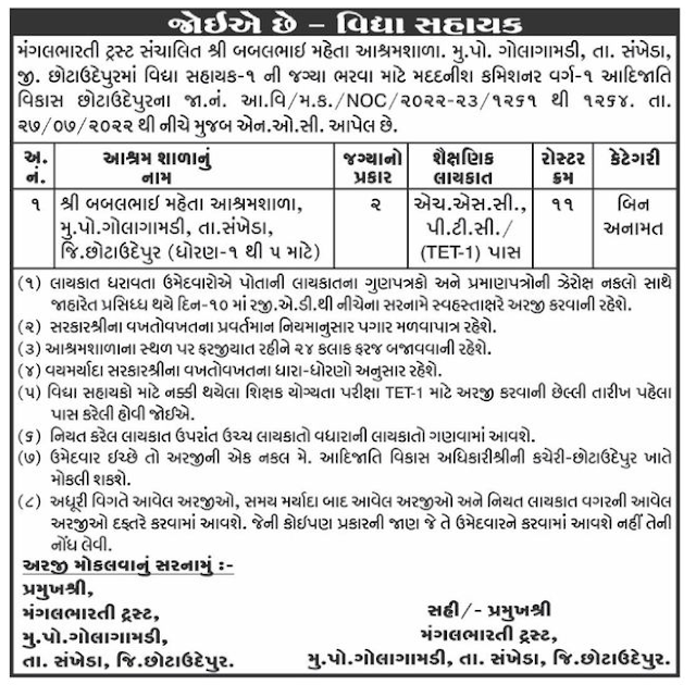 Shri MangalBharti Trust recently published Advertisement Recruitment for Vidhyashayak Post 2022. Eligible Candidates can apply for BABALBHAI MEHTA ASHRAM SHALA RECRUITMENT OF Vidhyashayak Post ADVERTISEMENT 2022. To apply for these posts eligible candidates are advised to refer to the official advertisement. Details for this post like education qualification, selection process, application fee, age limit, and how to apply for this post are given below.